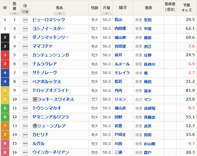 某競馬サイトからの出馬表です。オッズは予想ですので参考程度に。サトノレーブ1番人気は固いでしょうね。悲願のG1制覇なるかナムラクレア・トウシンマカオ、再びの載冠なるかルガル・ママコチャあたりが続きます。混戦模様ではないと思われます。できるだけ絞っていきたいですね。