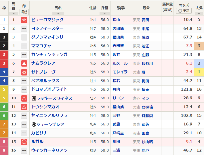 昨年の覇者ルガルも実力は確かでしょうし、去年圧勝していることから中山1200の適性もピカイチなので自信の対抗です。大外枠が嫌なので対抗まで。毎回惜しいレースのナムラクレアとトウシンマカオも馬券的には外せません。逆にママコチャは安定感あるも、年齢的にも気性的にもいいとこ4、5着かとおもい馬券からは外します。それならばと1番のピューロマジックをヒモに加えました。千直ではありますが前走の結果はよかったですし、単純なスピード能力において抜けている証拠だと思います。最内枠が揉まれるので心配ですが、逆に枠だけでみれば優位なので松山騎手のファインプレーに期待します。押さえの押さえでスプリント王国での実績も確かなラッキースワイネスの激走もあってもおかしくはないと思います。サラブレッドの仮面をかぶった最強生物のカーインライジングの前時代の王者ですね。どれだけ衰えがあるのか?日本のレースへの対応は?など疑問点は多々ありますが実績面からの馬券妙味は一番高いですね。