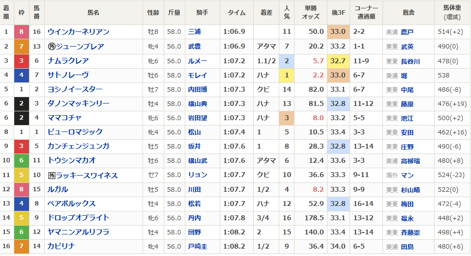 11番人気の8歳馬ウィンカーネリアンが直線でジューンブレアとの叩きあいを制して見事G1を制覇。騎手の三浦皇成さんは初G1制覇。苦節18年、127回目の挑戦でやっと掴んだ栄光となりました。記録だけみると苦労人ですがデビュー時は華々しい成績で武豊を超える新人が出てきたと非常に話題になりました。そのおかげか当時競馬番組に出演していた某グラビアアイドルと結婚しました。いろいろな噂が飛んだものでした。交際を巡って師匠との確執や周囲との対立など。もちろん真相は分かりませんが、そのあたりがこれまでの苦境の一因でしょう。どんな環境を作るかも本人次第なところがある厳しい世界ですので結果が全てです。念願のG1勝利を飾れたので、今後の活躍を期待しましょう。最後の直線での叩き合いでの気迫は凄まじいものがありました。あの気迫を忘れずに騎乗を続けて行って欲しいです。