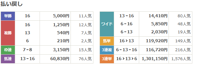 軸のサトノレーブが4着ということで見事に外れました。配当を見てもらえれば一目瞭然ですが、このレースでしっかりとした根拠で高配当を当てた人は相当な達人ですね。まず当たりません、ふつうは( ´艸`)8歳馬がG1で勝つとか誰以来?カンパニーとか?しかも騎手は皇成。私のような勝率重視の買い方ではまず手が出ない馬券でしたね。ということでこの結果は気にしないのが一番です!