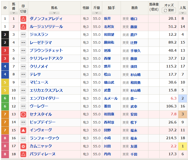1番人気のカムニャックの頭は固いと見ました。今回重視したのはオークスでの実績と距離実績。オークスで惨敗している馬は積極的に消しです。オークスの実績上位馬と逆にオークスに出ていない馬。そのなかでも2000mを経験している馬を相手に選びました。さらには事前情報で出していた調教評価なども加味して結論です。