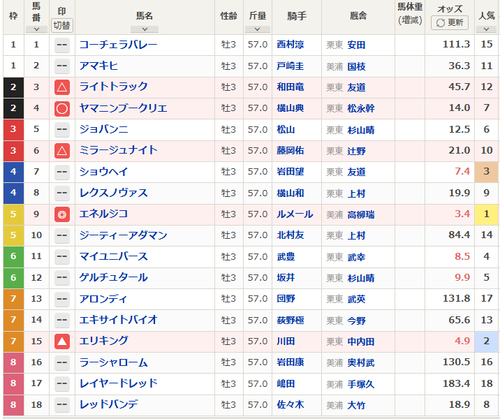 1番人気エネルジコは父がドゥラメンテで母系がドイツ血統ということで父も菊花賞馬出していますし母系もヨーロッパの重厚さが出ているので長距離&重馬場においては理想的のような気がします。左回りしか経験がありませんがそこは問題なしと思います。体調面で調整が難しくレース間隔が重要なため3歳のトライアルではなく新潟記念を使ってきたもよう。つまり、計画通りという事です。鞍上も非常に魅力的なので本命とします。対抗はヤマニンブークリエ。母系にヨーロッパ型の種牡馬が並び、特に母母父のエリシオがスタミナを伝えています。母父もチチカステナンゴと地味ですが、それだけにしぶとく先行前残りで頑張ってくれそうです。鞍上の典さんも長距離では魅力的なジョッキーです。