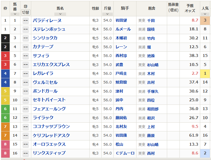 - フェアエールング — 輸送や馬場を気にする面のコメントもあるが、きっちり整えてきているという情報有り。 サラブレモバイル
