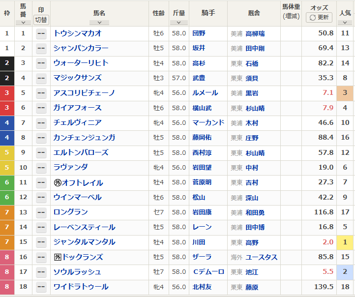 事前のオッズとしては4頭が抜けてますね。さらにはジャンタルマンタルがその中でもさらに抜けた1番人気でしょうか。ここまでマイルG1全勝してきて、出走可能なマイルG1全制覇に王手状態という素晴らしい戦績です。実績面考えれば1番人気は当然でしょう。春の安田記念の上位3頭がそのまま出てきて上位人気を形成しているのも珍しいですね。固そうな気がしてきました(-_-;)